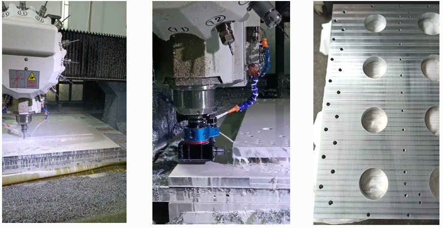 龍門加工中心對自動化設(shè)備大鋁板進(jìn)行雕銑、鉆孔、攻牙、切削等加工